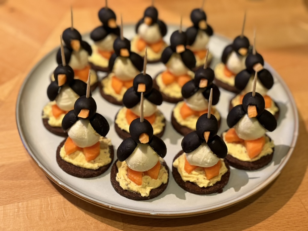Pinguin-Häppchen auf Pumpernickel